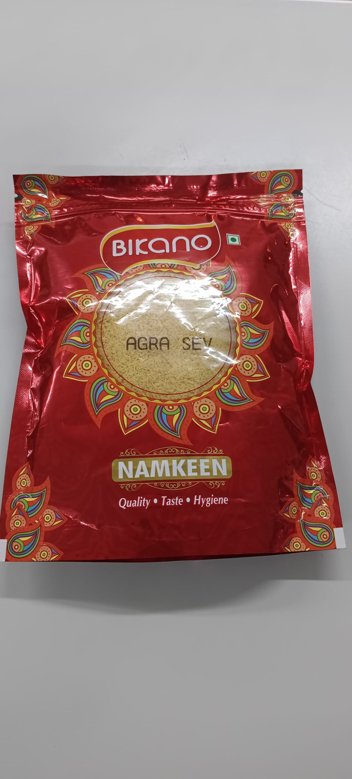 Bikano Agra Sev is a popular Indian namkeen (savory snack) known for its crunchy texture and distinct flavor, often described as a blend of sweet and spicy notes, made by the well-known brand Bikano