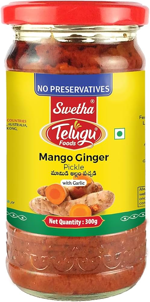 Telugu Foods Swetha Mango Ginger Pickle is a unique blend of juicy mangoes and aromatic ginger, offering a tangy and spicy experience. Made with authentic recipes, this pickle is a perfect companion for traditional Indian meals.